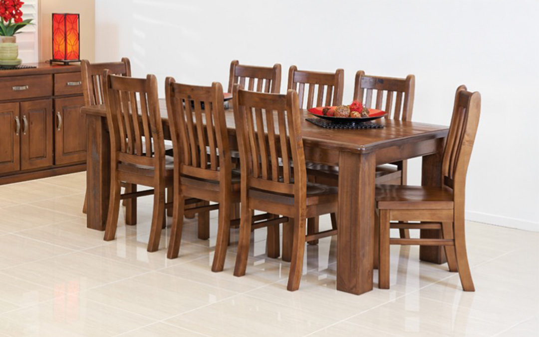 Elton Dining Table with Chairs – Solid, rustic, and built to last. Multiple sizes & matching furniture available to complete your home. Buy Now, Pay Weekly with finance options & NZ-wide delivery!