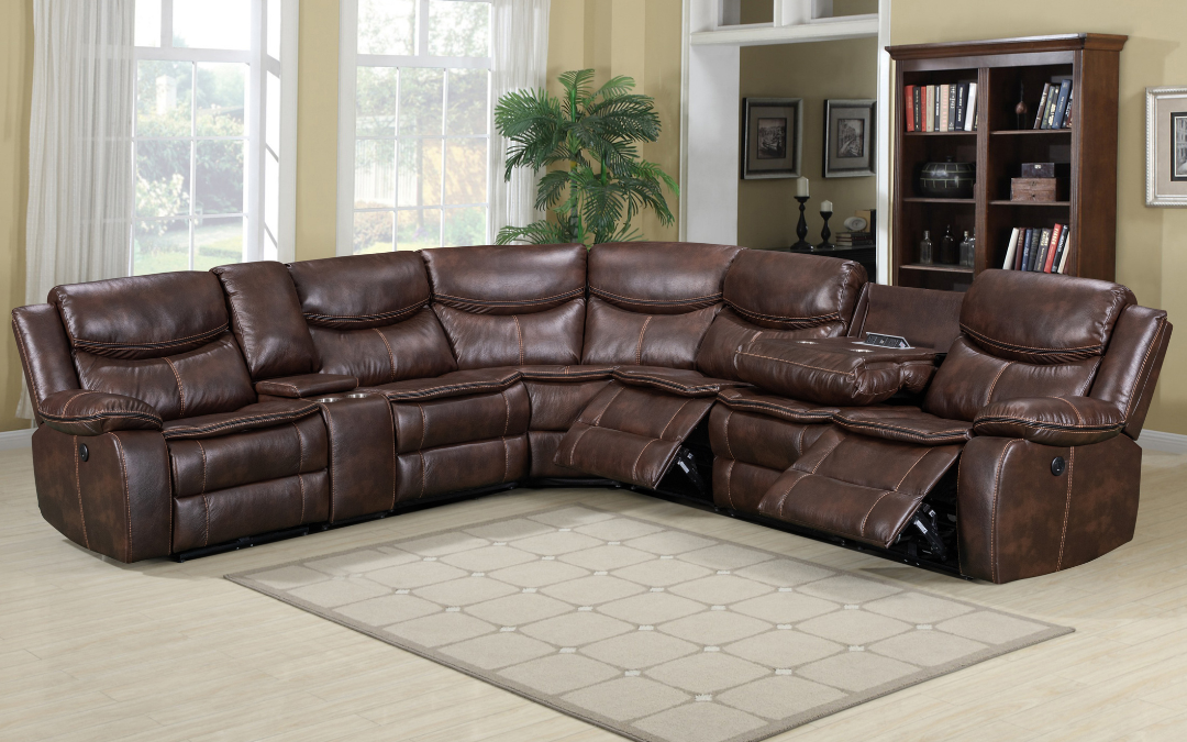 Each seat is luxuriously covered in sleek brown leatherette, providing a cool and relaxing touch to your living room. With plush cushions and stylish baseball stitching, this sofa combines comfort and elegance seamlessly. Transform your family time and create a harmonious atmosphere with our Reclining Sectional Sofa. Don’t miss out on the opportunity to add style and functionality to your living room. Hurry, get yours now! Product Features: Transitional design Brown color Breathable leatherette Double stitching Recliner Cup holders & console.